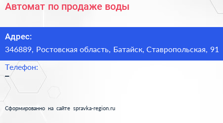 Автомат по продаже воды по адресу 346889, Ростовская область, Батайск, Ставропольская, 91 в дальнейшем Организация, размещена в следующих категориях: