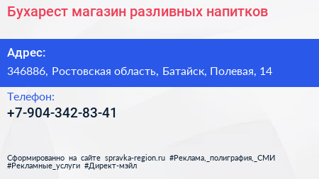 Бухарест, магазин разливных напитков по адресу 346886, Ростовская область, Батайск, Полевая, 14 в дальнейшем Организация, размещена в следующих категориях: