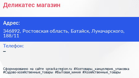 Деликатес, магазин по адресу 346892, Ростовская область, Батайск, Луначарского, 188/11 в дальнейшем Организация, размещена в следующих категориях: