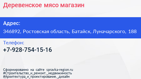 Деревенское мясо, магазин по адресу 346892, Ростовская область, Батайск, Луначарского, 188 в дальнейшем Организация, размещена в следующих категориях:
