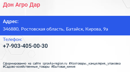 Дон Агро Дар по адресу 346880, Ростовская область, Батайск, Кирова, 9а в дальнейшем Организация, размещена в следующих категориях: