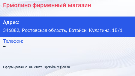 Ермолино, фирменный магазин по адресу 346882, Ростовская область, Батайск, Кулагина, 1Б/1 в дальнейшем Организация, размещена в следующих категориях: