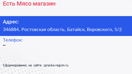 Есть Мясо, магазин по адресу 346884, Ростовская область, Батайск, Воровского, 5/2 в дальнейшем Организация, размещена в следующих категориях: