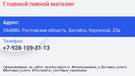 Главный пивной, магазин по адресу 346880, Ростовская область, Батайск, Крупской, 23а в дальнейшем Организация, размещена в следующих категориях: