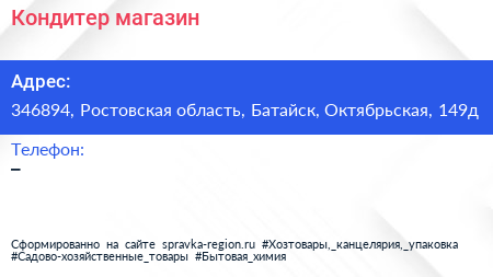 Кондитер, магазин по адресу 346894, Ростовская область, Батайск, Октябрьская, 149д в дальнейшем Организация, размещена в следующих категориях: