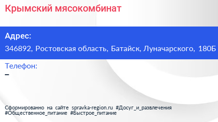 Крымский мясокомбинат по адресу 346892, Ростовская область, Батайск, Луначарского, 180Б в дальнейшем Организация, размещена в следующих категориях: