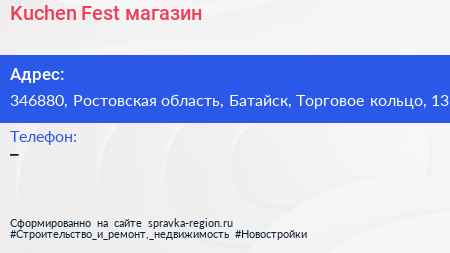 Kuchen Fest, магазин по адресу 346880, Ростовская область, Батайск, Торговое кольцо, 13 в дальнейшем Организация, размещена в следующих категориях: