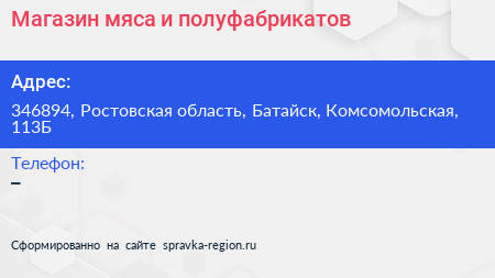 Магазин мяса и полуфабрикатов по адресу 346894, Ростовская область, Батайск, Комсомольская, 113Б в дальнейшем Организация, размещена в следующих категориях: