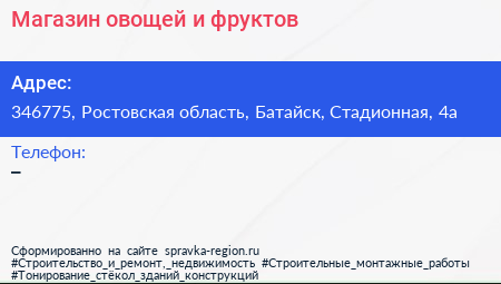 Магазин овощей и фруктов по адресу 346775, Ростовская область, Батайск, Стадионная, 4а в дальнейшем Организация, размещена в следующих категориях: