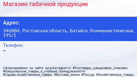 Магазин табачной продукции по адресу 346884, Ростовская область, Батайск, Коммунистическая, 195/1 в дальнейшем Организация, размещена в следующих категориях: