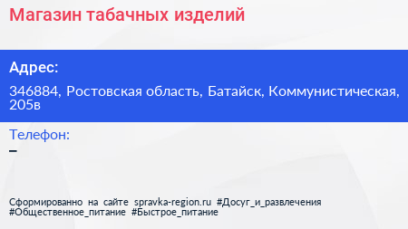 Магазин табачных изделий по адресу 346884, Ростовская область, Батайск, Коммунистическая, 205в в дальнейшем Организация, размещена в следующих категориях: