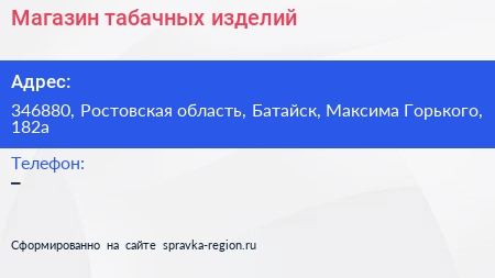 Магазин табачных изделий по адресу 346880, Ростовская область, Батайск, Максима Горького, 182а в дальнейшем Организация, размещена в следующих категориях: