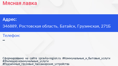 Мясная лавка по адресу 346889, Ростовская область, Батайск, Грузинская, 271Б в дальнейшем Организация, размещена в следующих категориях: