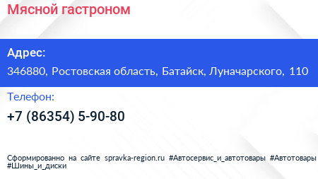 Мясной гастроном по адресу 346880, Ростовская область, Батайск, Луначарского, 110 в дальнейшем Организация, размещена в следующих категориях: