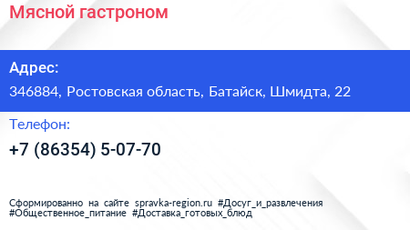 Мясной гастроном по адресу 346884, Ростовская область, Батайск, Шмидта, 22 в дальнейшем Организация, размещена в следующих категориях: