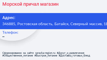 Морской причал, магазин по адресу 346885, Ростовская область, Батайск, Северный массив, 1Б в дальнейшем Организация, размещена в следующих категориях: