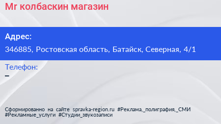 Mr.колбаскин, магазин по адресу 346885, Ростовская область, Батайск, Северная, 4/1 в дальнейшем Организация, размещена в следующих категориях: