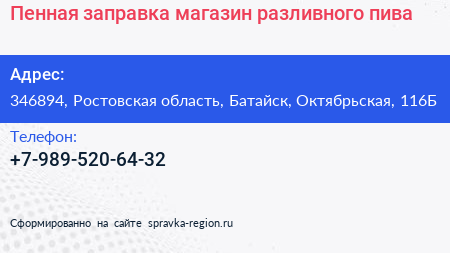 Пенная заправка, магазин разливного пива по адресу 346894, Ростовская область, Батайск, Октябрьская, 116Б в дальнейшем Организация, размещена в следующих категориях: