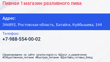 Пивная №1, магазин разливного пива по адресу 346892, Ростовская область, Батайск, Куйбышева, 144 в дальнейшем Организация, размещена в следующих категориях: