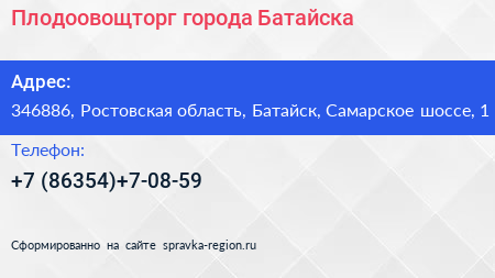 Плодоовощторг города Батайска по адресу 346886, Ростовская область, Батайск, Самарское шоссе, 1 в дальнейшем Организация, размещена в следующих категориях: