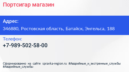 Портсигар, магазин по адресу 346880, Ростовская область, Батайск, Энгельса, 188 в дальнейшем Организация, размещена в следующих категориях: