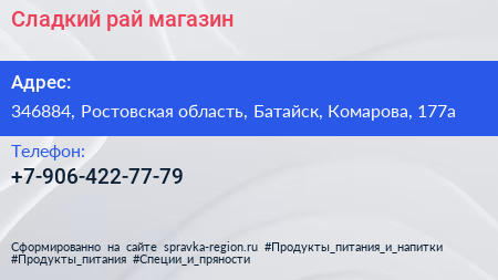 Сладкий рай, магазин по адресу 346884, Ростовская область, Батайск, Комарова, 177а в дальнейшем Организация, размещена в следующих категориях: