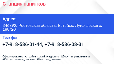 Станция напитков по адресу 346892, Ростовская область, Батайск, Луначарского, 188/20 в дальнейшем Организация, размещена в следующих категориях: