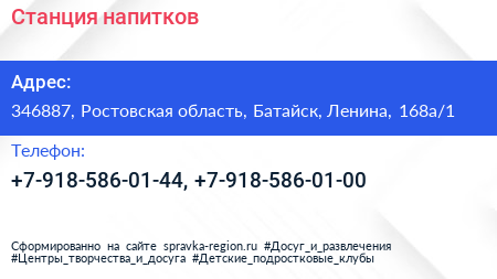 Станция напитков по адресу 346887, Ростовская область, Батайск, Ленина, 168а/1 в дальнейшем Организация, размещена в следующих категориях: