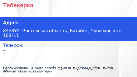 Табакерка по адресу 346892, Ростовская область, Батайск, Луначарского, 188/11 в дальнейшем Организация, размещена в следующих категориях: