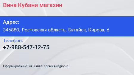 Вина Кубани, магазин по адресу 346880, Ростовская область, Батайск, Кирова, 6 в дальнейшем Организация, размещена в следующих категориях: