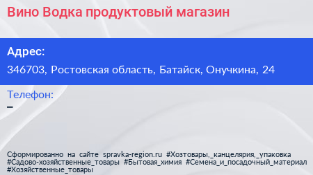 Вино - Водка, продуктовый магазин по адресу 346703, Ростовская область, Батайск, Онучкина, 24 в дальнейшем Организация, размещена в следующих категориях: