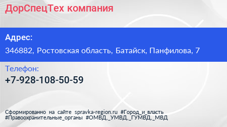 ДорСпецТех, компания по адресу 346882, Ростовская область, Батайск, Панфилова, 7 в дальнейшем Организация, размещена в следующих категориях: