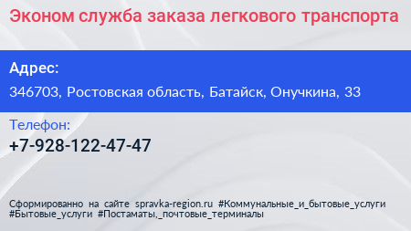 Эконом, служба заказа легкового транспорта по адресу 346703, Ростовская область, Батайск, Онучкина, 33 в дальнейшем Организация, размещена в следующих категориях: