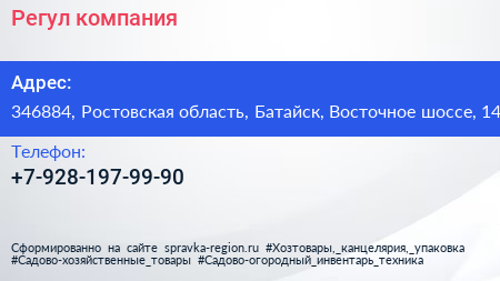 Регул, компания по адресу 346884, Ростовская область, Батайск, Восточное шоссе, 14 в дальнейшем Организация, размещена в следующих категориях: