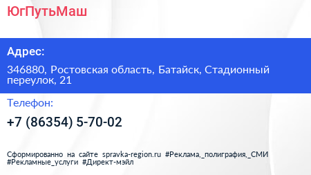 ЮгПутьМаш по адресу 346880, Ростовская область, Батайск, Стадионный переулок, 21 в дальнейшем Организация, размещена в следующих категориях: