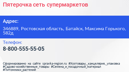 Пятерочка, сеть супермаркетов по адресу 346889, Ростовская область, Батайск, Максима Горького, 582д в дальнейшем Организация, размещена в следующих категориях:
