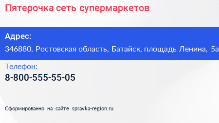 Пятерочка, сеть супермаркетов по адресу 346880, Ростовская область, Батайск, площадь Ленина, 5а в дальнейшем Организация, размещена в следующих категориях: