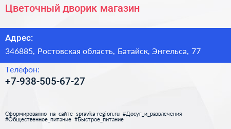 Цветочный дворик, магазин по адресу 346885, Ростовская область, Батайск, Энгельса, 77 в дальнейшем Организация, размещена в следующих категориях: