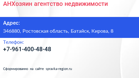 АНХозяин, агентство недвижимости по адресу 346880, Ростовская область, Батайск, Кирова, 8 в дальнейшем Организация, размещена в следующих категориях:
