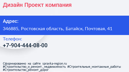 Дизайн-Проект, компания по адресу 346885, Ростовская область, Батайск, Почтовая, 41 в дальнейшем Организация, размещена в следующих категориях: