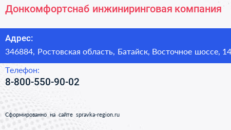 Донкомфортснаб, инжиниринговая компания по адресу 346884, Ростовская область, Батайск, Восточное шоссе, 14 в дальнейшем Организация, размещена в следующих категориях: