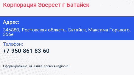 Корпорация Эверест, г. Батайск по адресу 346880, Ростовская область, Батайск, Максима Горького, 356е в дальнейшем Организация, размещена в следующих категориях: