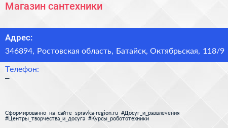 Магазин сантехники по адресу 346894, Ростовская область, Батайск, Октябрьская, 118/9 в дальнейшем Организация, размещена в следующих категориях: