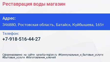 Реставрация воды, магазин по адресу 346880, Ростовская область, Батайск, Куйбышева, 165т в дальнейшем Организация, размещена в следующих категориях: