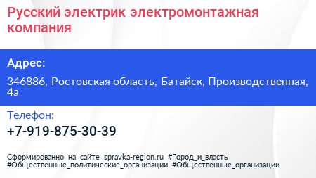 Русский электрик, электромонтажная компания по адресу 346886, Ростовская область, Батайск, Производственная, 4а в дальнейшем Организация, размещена в следующих категориях:
