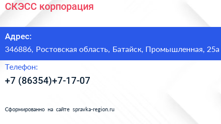 СКЭСС, корпорация по адресу 346886, Ростовская область, Батайск, Промышленная, 25а в дальнейшем Организация, размещена в следующих категориях: