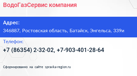 ВодоГазСервис, компания по адресу 346887, Ростовская область, Батайск, Энгельса, 339и в дальнейшем Организация, размещена в следующих категориях: