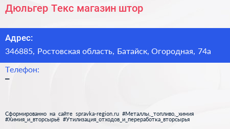Дюльгер Текс, магазин штор по адресу 346885, Ростовская область, Батайск, Огородная, 74а в дальнейшем Организация, размещена в следующих категориях: