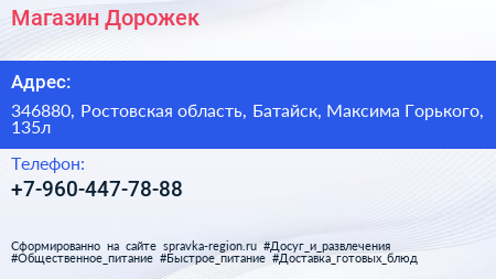 Магазин Дорожек по адресу 346880, Ростовская область, Батайск, Максима Горького, 135л в дальнейшем Организация, размещена в следующих категориях: