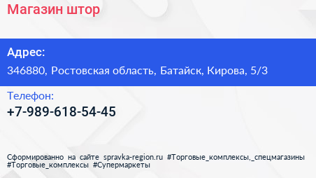 Магазин штор по адресу 346880, Ростовская область, Батайск, Кирова, 5/3 в дальнейшем Организация, размещена в следующих категориях: